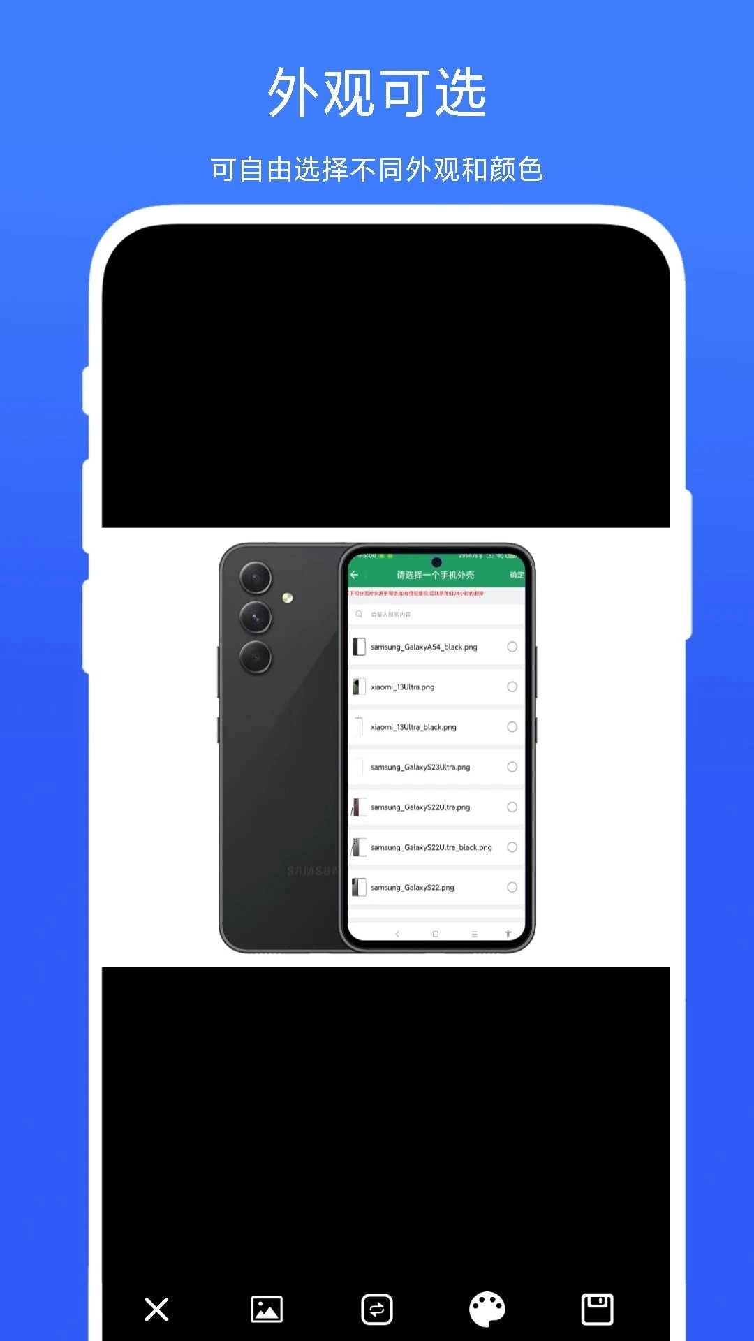 3. 为自己手机里现有的图片添加外壳,可挑选不同品牌与型号的手机外壳。