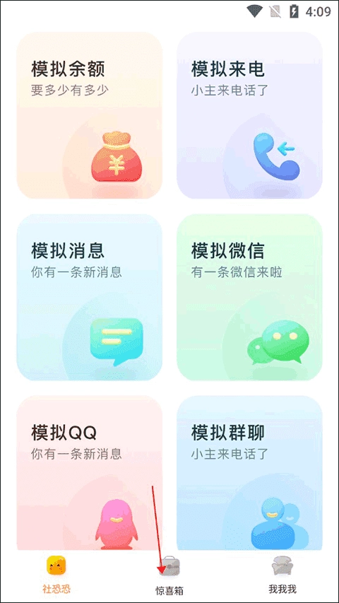 首先,打开社恐快逃后,进入主界面可以看到一系列针对社恐人士设计的功能模块。点击底部导航栏中的“惊喜箱”,即可发现更多隐藏功能。