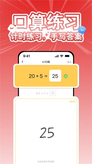 2、口算练习,手写答案:在线练习题贴合不同学龄阶段的教材内容和海量题库可供选择,手写即可作答,方便快捷。