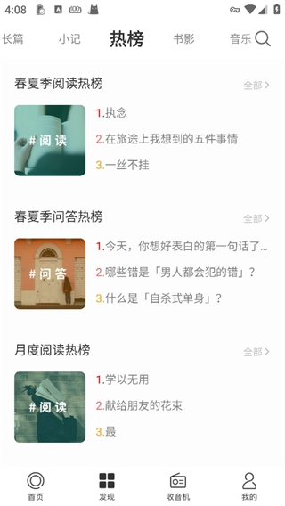 3、轻点发现栏,便能浏览各类专栏,其中涵盖阅读、图文、专题、热搜榜、问答、音乐以及影视等。