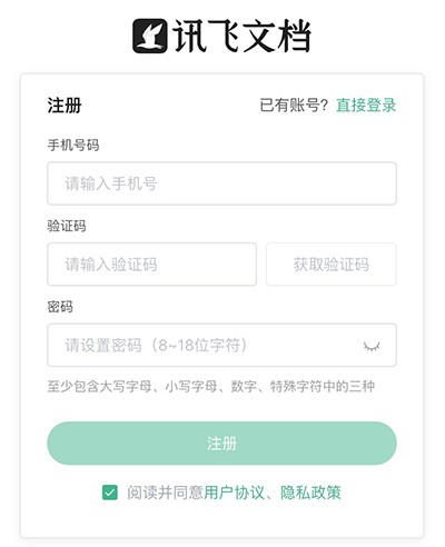 以手机版来说,在注册账号这一环节能够发现,讯飞当下仅支持通过手机号来注册账户。不过要是点击「直接登录」,页面便会提示,你能够使用微信直接登录,在绑定微信之后,依然会建议用户将其与手机号进行绑定,确保一个手机号对应一个账户,从而最大程度保障用户信息安全。