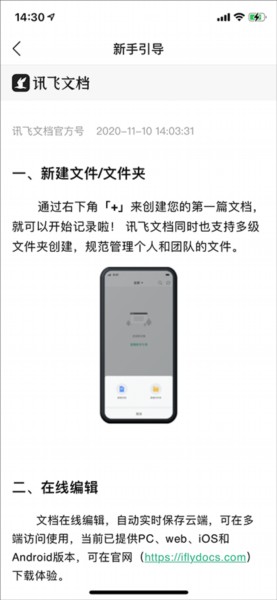 若想在创建文档前快速上手使用讯飞文档,它配备了新手操作指南(新手引导),可作为产品使用说明,在使用过程中随时查阅。以手机App版为例,如下图所示: