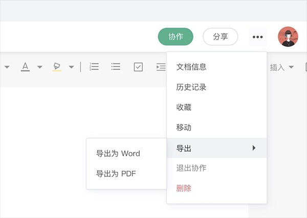 在文档导出阶段,我们能够发现「讯飞文档」当下仅能够导出为Word和PDF格式的文档,而这两种文档类型在当前办公场景中较为常用。