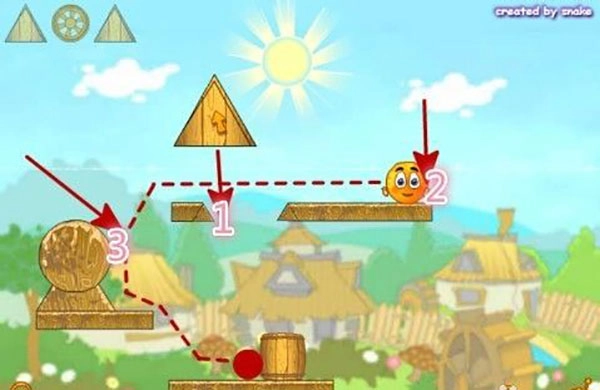 5、来到第五关,首先把三角木块放置到1号位置,放置时要留意,距离间隙得稍微带点斜度,如此三角木块才能平稳放置。接着,用车轮按顺序把橙子往下方推,要是不按顺序,橙子就会滚出去。最后,把三角木块挪到3号位置,然后就静静等待胜利吧!