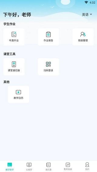 3、主界面设有教学助手、云教研、通讯录、教师发展和我的等几个常用功能。其中,在教学助手中,用户能够详细查看学生作业、课堂工具以及教学日历。