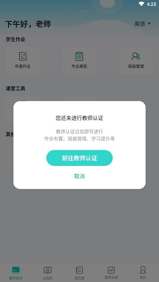 4、此外,在云教研、通讯录、教师发展以及“我的”板块,均需进行教师认证,待教师认证通过后便可使用。