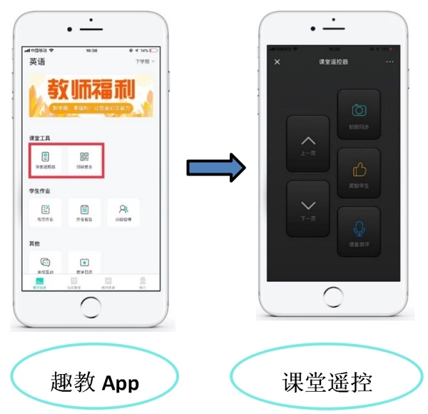 通过手机中的趣教App,能够对课堂宝遥控器功能进行无线操控,实现在授课状态下课堂宝的翻页、拍照同步、奖励学生以及语音测评等功能。
