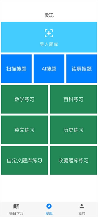 3、在发现模块可以自由导入题库、还饿可以扫描搜题、AI搜题、读屏搜题等等,还可以选择联系题目类型,非常强大;