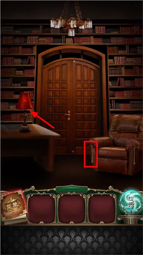 3、来到第三关,我们在沙发上找到一根绳子,接着将这根绳子放置到左边台灯的位置。待场景亮起来后,我们发现左下角有个红色按钮,按下该按钮,便进入第四关。