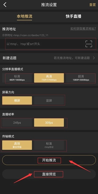 4、完成设置后,点击“直接预览”或“开始推流”,就能开启直播。把观看地址分享出去,观众便能观看直播。