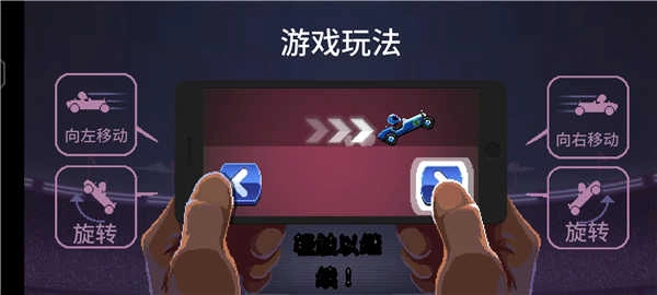 1、通过左右操作来控制赛车移动,当赛车处于空中状态时,可操控其进行翻转。