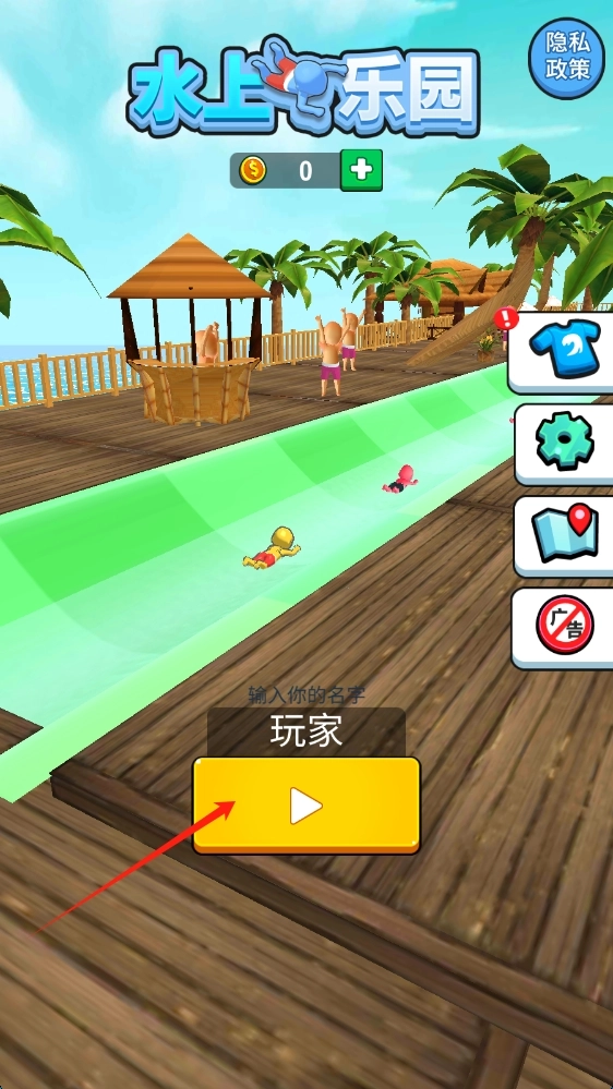 1、在水上乐园游戏的启动界面,输入名字之后,点击黄色按钮,即可开启水上滑道竞技之旅。此外,还能点击右侧相应的功能按钮。