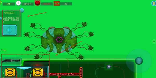 4、在游戏过程中,你能在界面的左上方瞧见任务指引。此时,你得操控自己的角色,依照指引展开游戏。当遭遇敌人时,点击界面下方的武器,就能发起攻击并消灭敌人。玩家按照任务指引完成任务之后,游戏便算过关,进而进入下一关卡。