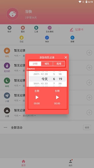 - 喂奶相关:涵盖母乳喂养、配方奶喂养、喂泵奶以及泵奶记录。支持以计时方式填写记录,也可进行补录,并且提供闹钟提醒功能。