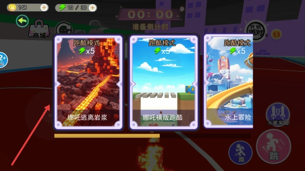 1. 挑选哪吒逃离岩浆跑酷模式,进而进入关卡。在此关卡中,操控角色于岩浆不断上升的场景里奔跑,并收集钥匙等各类道具。