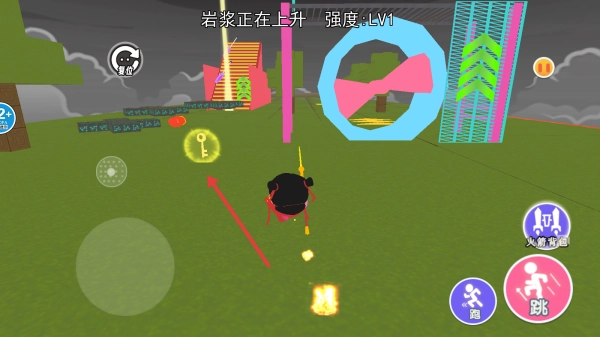 2、借助跑、跳按钮跨越障碍,避开岩浆,顺着路径前进。留意岩浆的上升速度,当前强度为LV1,务必持续移动。