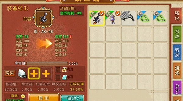 当你点击想要强化的武器后,就能放入对应的强化石。要留意的是,强化等级越高,消耗的金币和强化石数量就越多,不过强化加成的属性也会越高。大家无需担忧强化失败,毕竟强化失败后会累积幸运值,一旦幸运值达到100%,下次强化必定成功!