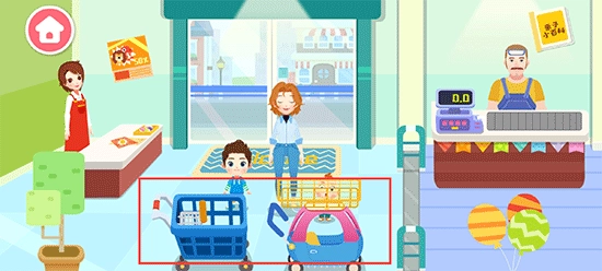 4、打造贴近真实生活的超市购物情境与角色设定,其中包含琳琅满目的商品、规划清晰的购物分区,配备购物车,还设有超市收银员等元素。