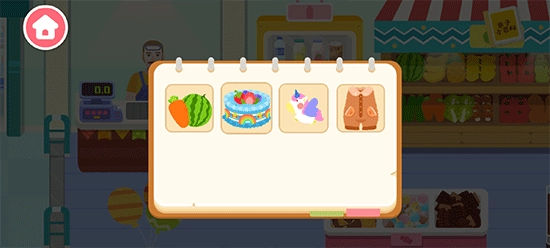 通过颜色与外形特点来识别商品,以此锻炼宝宝的辨认能力。香蕉属于黄色的水果,西红柿是圆溜溜的蔬菜。那桃子是什么样的呢?让宝宝点点对应的商品,借助语音提示,助力宝宝知晓商品的名称。