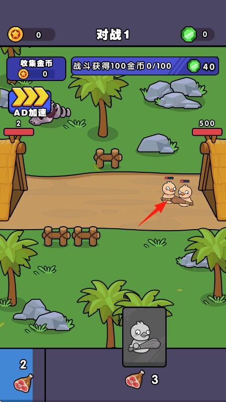 1. 在对战1里,点击红箭头所指的1块肉,要耗费3个肉块来召唤相应小鸡,并布置到战场上,做好战斗准备。