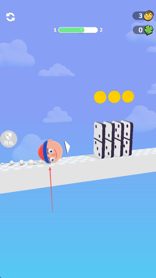 1、控制角色在平台上前行,躲避像多米诺骨牌一样的障碍物,同时收集上方的金币。