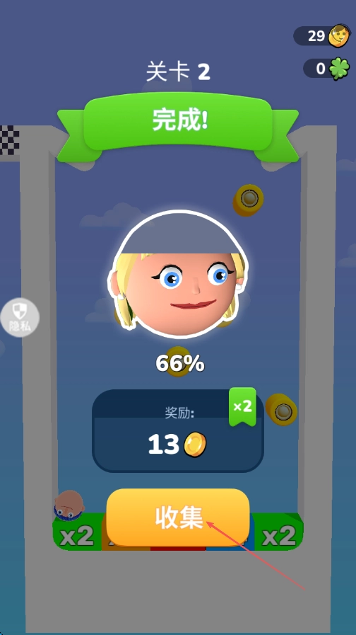 4、当到达关卡终点,看到完成界面时,点击收集按钮,领取金币奖励。