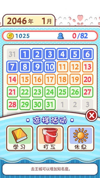 12、在“日程安排”板块,点击日期后,可选择希望她开展的活动,无论是学习、打工还是休息皆可。需留意合理安排,做到劳逸结合,否则疲劳值会上升,进而可能引发身体不适。