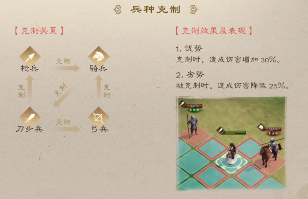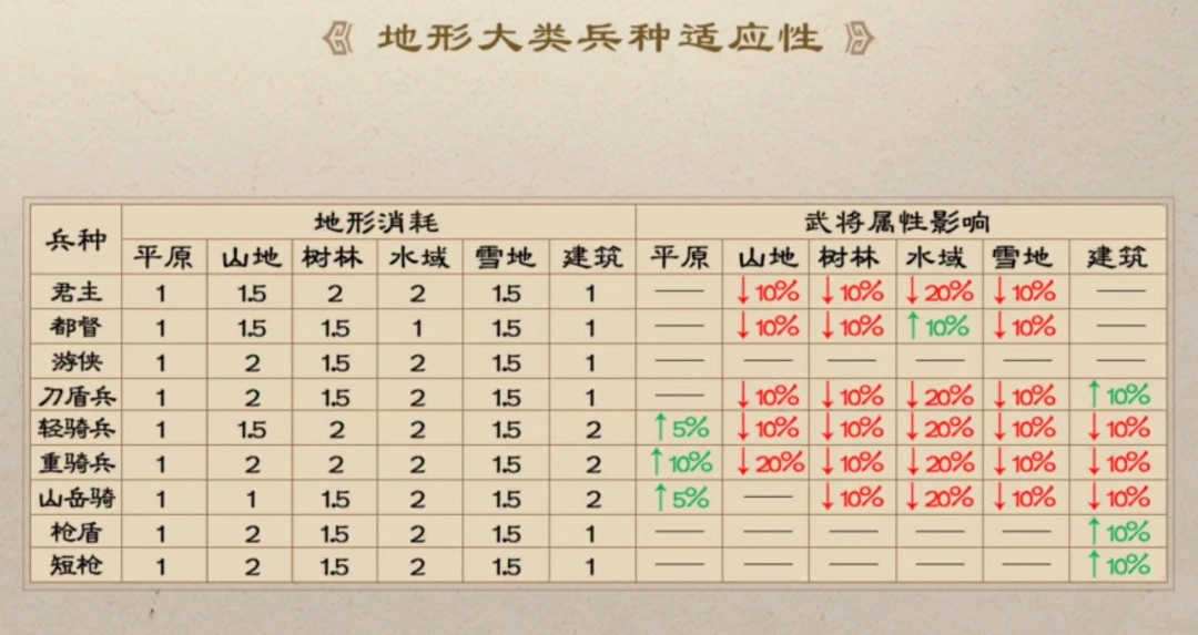 兵种:在新曹操传里,武将的兵种至关重要。每个兵种都具备特定的特性,随着兵种不断升阶,其特性会逐步解锁。而且,部分兵种交战时存在克制关系,像枪兵克制骑兵,骑兵克制刀步兵等。虽说新曹操传不像传统战棋游戏那样有三色相互克制的设定,但兵种间的这种克制极为关键,30%的伤害提升可不是虚言。此外,兵种在不同地形上的移动力消耗也不一样,这一点大家需要提前留意。