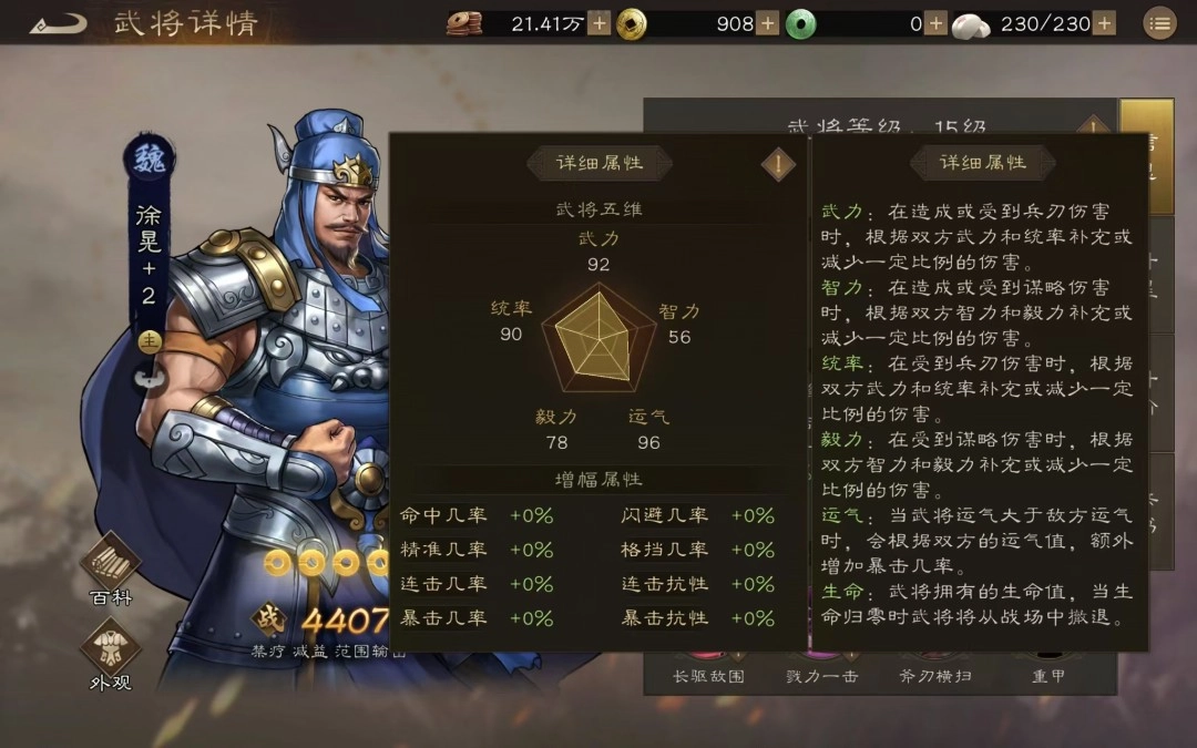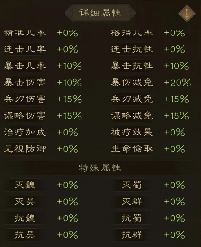 当然,在属性方面仍存在一些细节有待补充。如上图所示,新三曹的属性实际上较为丰富。以增幅属性为例,除了常见的命中、闪避,还包括精准(决定对方格挡几率高低)、格挡(触发后可减伤)、连击、灭蜀/魏/吴/群(对不同势力武将有额外增伤)、竞技增减伤、竞技灭蜀/魏/吴/群等属性。鉴于属性众多,我们必须合理考量,才能充分发挥其在实战中的效应。