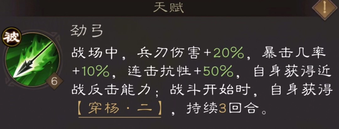 每位武将还有独特的天赋设定,这在许多同类型游戏中颇为常见。天赋与技能,是决定一个角色不可替代的关键因素。比如,上图展示的是新手可自选获得的5星武将黄忠的天赋。除了兵刃增伤、暴击提升、连击抗性提升外,其关键天赋是近战反击能力。黄忠作为弓骑兵职业,本身不具备近战1格输出能力,而这个天赋使黄忠走位更加从容。战斗开始3回合内,黄忠还能额外获得30%的兵刃增伤,加上原有的增伤效果,3回合内他总计可获得50%的兵刃增伤,这是相当强力的增益。