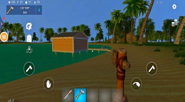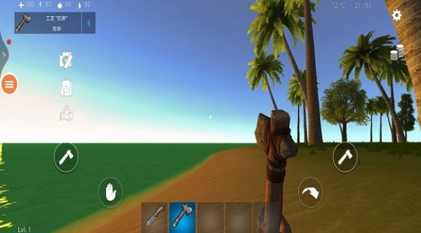 2、获取石斧工具解锁,顺着海滩漫步,采集一些可用资源。