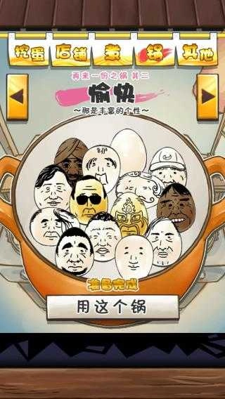 1在游戏里,玩家得耗费些时间,把各类盐配料进行搭配,用来煮熟鸡蛋。等鸡蛋煮好出锅,只需用手指在屏幕上轻轻滑动,将鸡蛋剥开,一张独具个性的大叔脸便会赫然出现在你眼前。