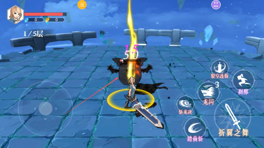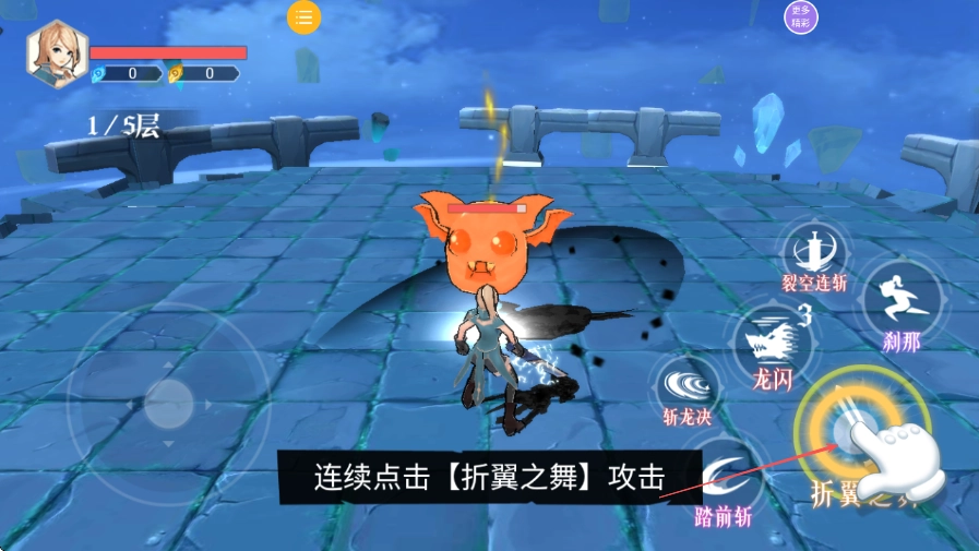 1. 踏入1/5层的战斗场景,当看到橙色怪物出现后,依照提示不间断地点击折翼之舞按钮展开攻击。