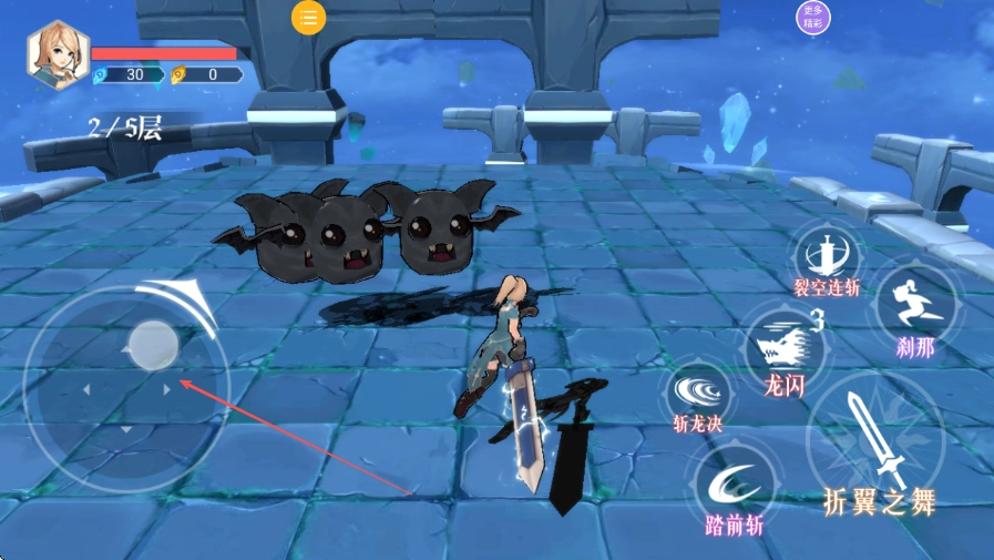 3、来到2/5层,借助左侧虚拟摇杆控制角色走位,以躲避三只黑色怪物的攻击。