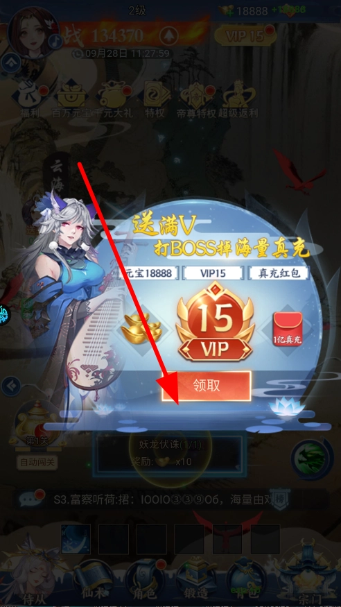 2、游戏开局即可领取福利,诸如满VIP、元宝等,点击领取后,这些福利将为前期冒险提供资源,助力角色成长。