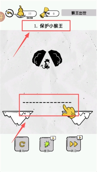 2、依照红色箭头的指示,点击黄色手掌图标,以此填补地面裂缝,防止黑色小猴王被龙卷风卷走,达成保护任务的目标。