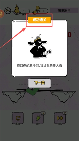 4、完成通关后,点击橙色的“成功通关”按钮,即可查看对话内容。随后,你能够选择点击“下一关”继续进行游戏,也可以利用底部的“重玩”或“跳过”功能。