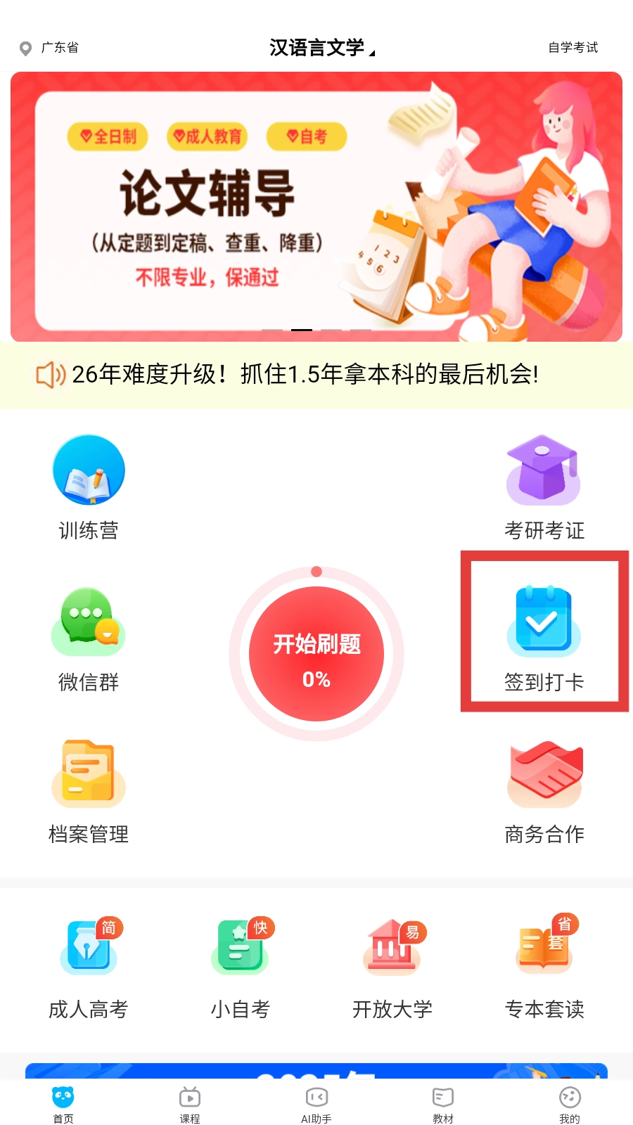 1. 于熊猫自考应用的首页,点击【签到打卡】,随即进入打卡页面。