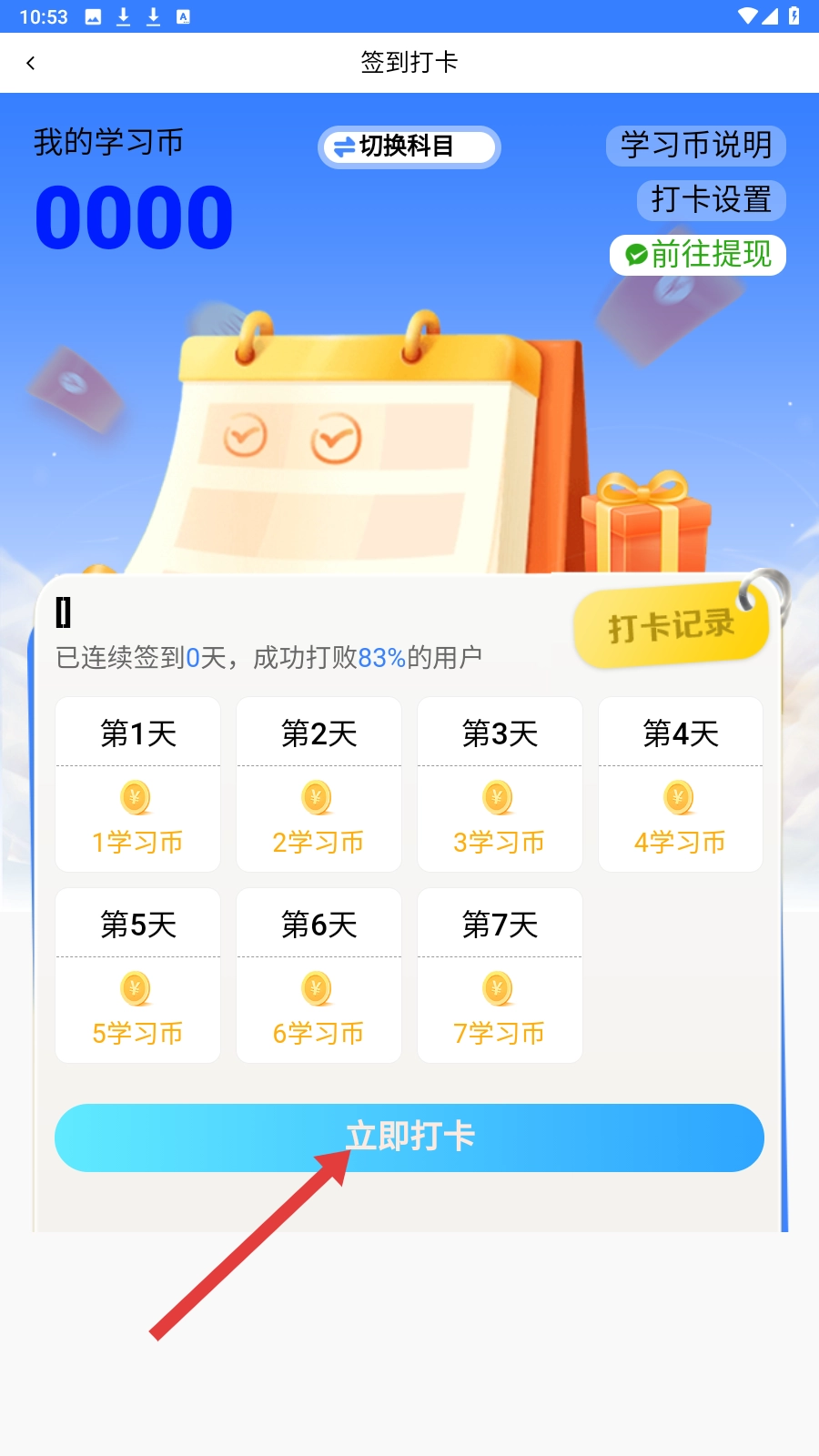 2. 于打卡页面,轻点【立即打卡】,即可完成当日的学习打卡操作。