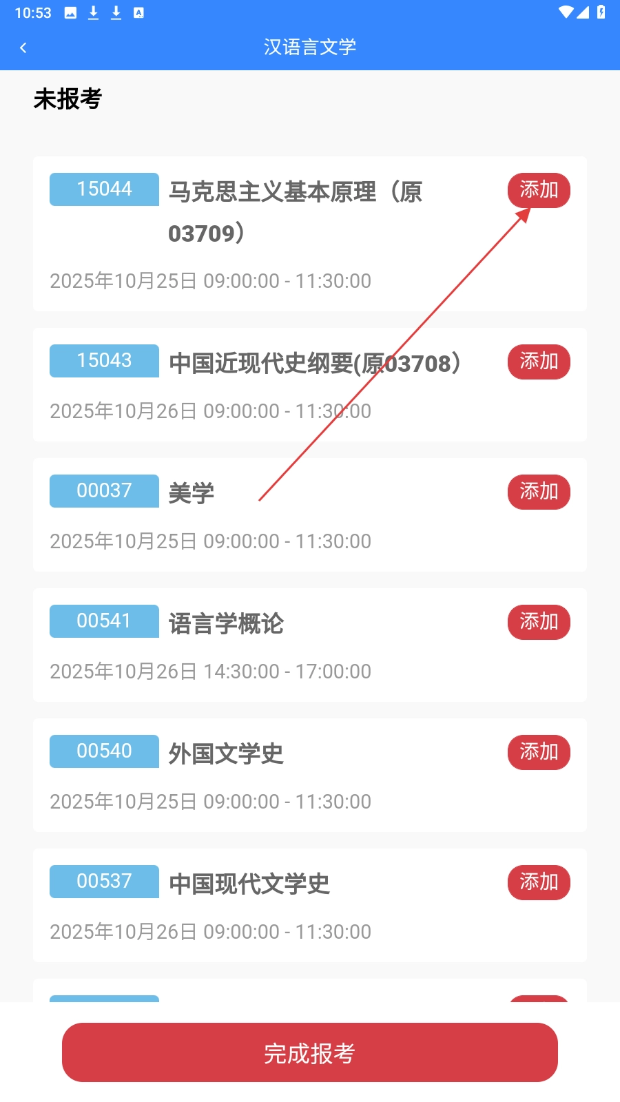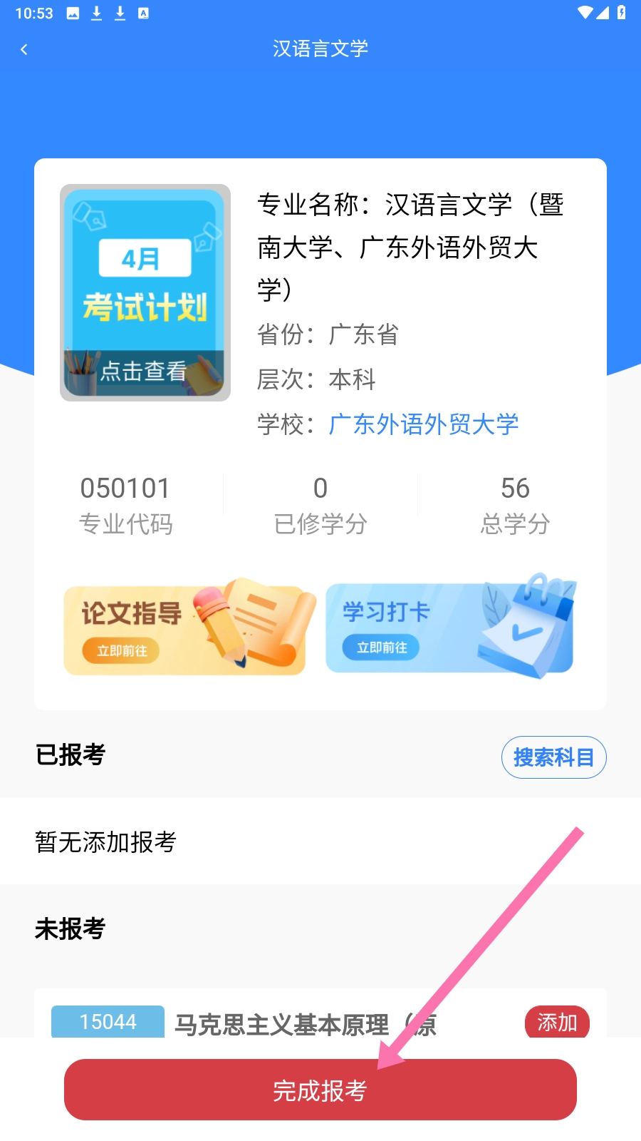 4、选定科目后,点击页面底部的【完成报考】按钮,以确认报考科目。