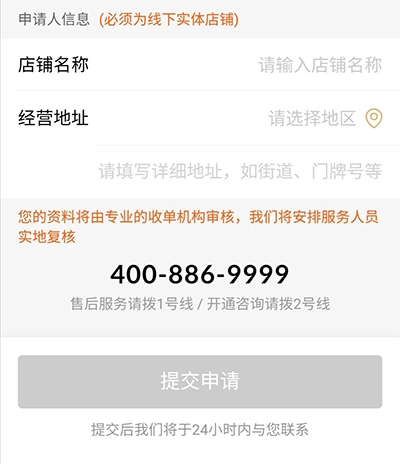 5、完成填写后,点击“提交”。提交申请表单后,收钱吧专员将在24小时内进行电话回访。