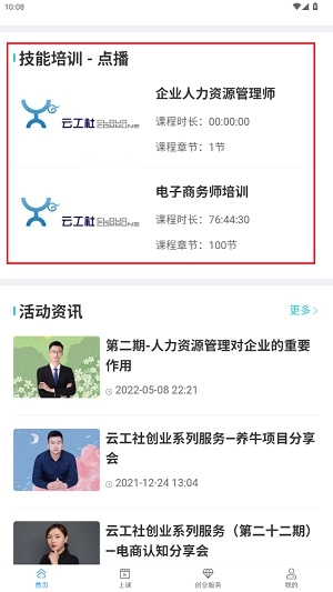 1、当用户进入云工社,于首页能够选择观看创业培训直播。