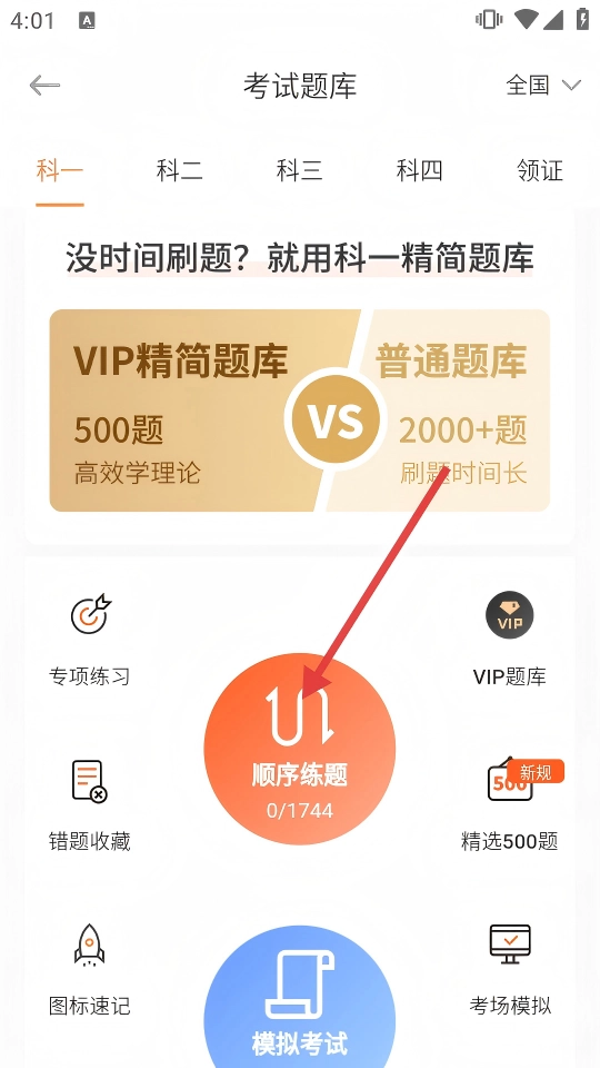 3、于考试题库页面,点击【顺序练题】按钮,随即能够进入答题模式并开启练习。