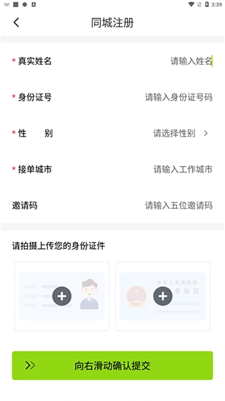 2. 请按照要求依次填写姓名、证件号码、性别以及接单城市等信息,随后拍摄身份证并上传,完成上述操作后提交。待审核通过,即可开始接单。