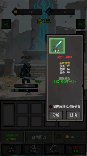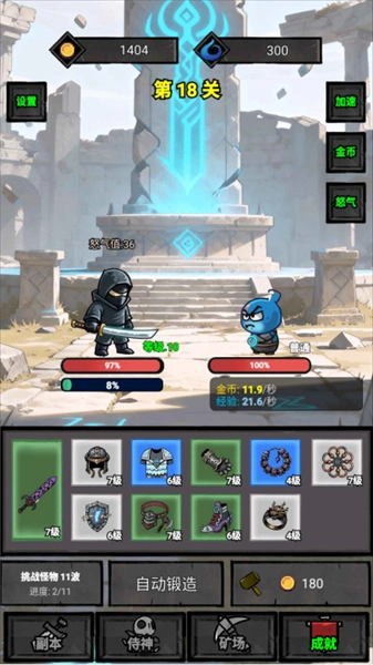 2. 于战斗界面,角色会自行展开战斗,向关卡怪物发起挑战。在战斗进程里,能够获取金币、经验等各类资源,与此同时积攒怒气值。在界面底部,可查看当下装备与关卡进度,而且还能借助 “副本”“侍神”“矿场”“成就” 等功能按键,对资源进行管理以及培养角色。