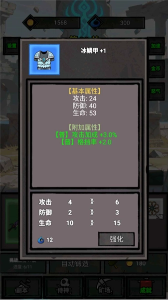 5.挑选出想要强化的装备,仔细查看它的基本属性与附加属性,耗费对应的资源(像蓝色材料),接着点击 “强化” 按钮,以此提升装备的攻击、防御、生命值等属性,进而增强角色的战斗能力。