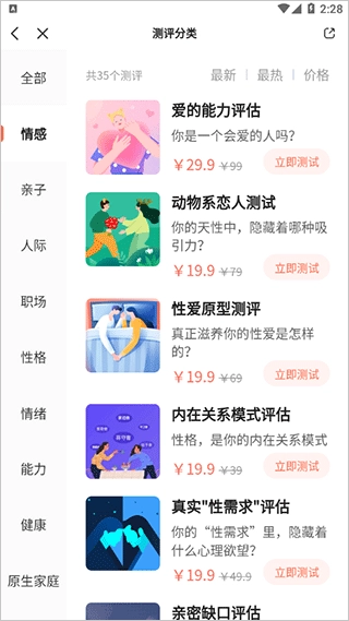 3、具备各类心理测评,每个测评都实时标注了已测人数,点击即可直接开启检测。