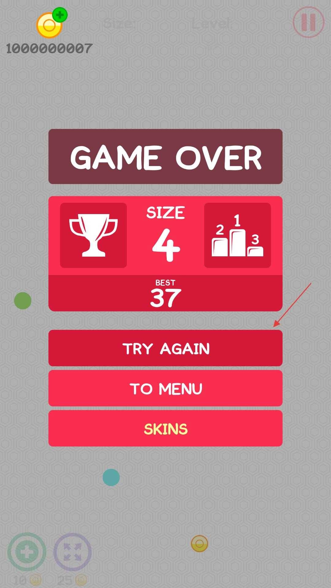 4、游戏结束后,会进入游戏结束页面,在此页面中,你能看到本次游戏的尺寸成绩以及最佳成绩。同时,页面上设有“再试一次”“返回菜单”“皮肤”等按钮,通过点击这些按钮,你可以选择重新尝试游戏、返回菜单或者更换皮肤。