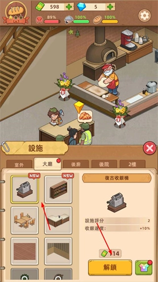1. 在设施界面进行设施的解锁与升级操作,以此提高店铺装饰评分,加快收银速度,进而优化经营环境。