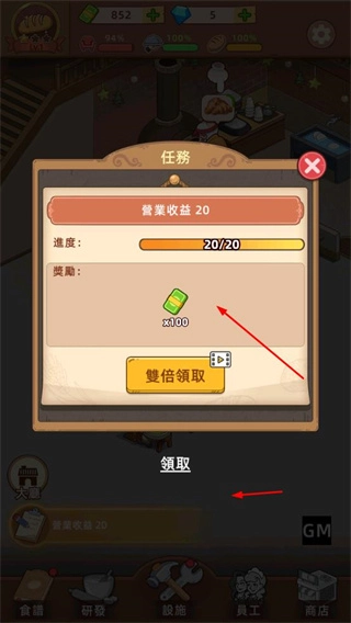3、任务完成后,可领取金币奖励,还能选择双倍领取,积累这些资源,以便用于店铺设施的升级与发展。